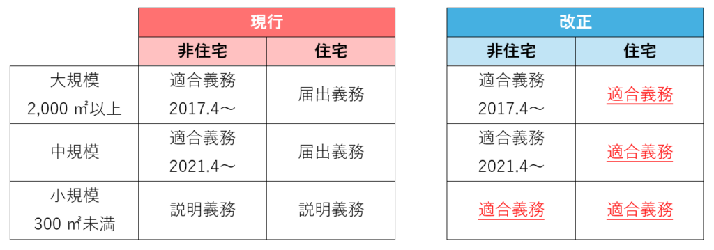 これだけは覚えておくんじゃ、現行制度では「届出義務」や「説明義務」でよかった建物でも2025年4月からは、全面的に「適合義務」が課せられたんじゃよ。