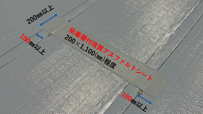 (c)増張り用シートを突付け張りした場合、施工中の水の浸入やトーチバーナーの炎による断熱材への引火等の危険性があることから増張り用シート相互は重ね合わせ、その重ね幅は30㎜程度とする。
