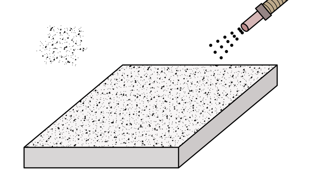「セメントの表面に砂(砕石)等を沈め、高速で小さな鉄球を吹き付け、表面処理したコンクリート平板」じゃな
